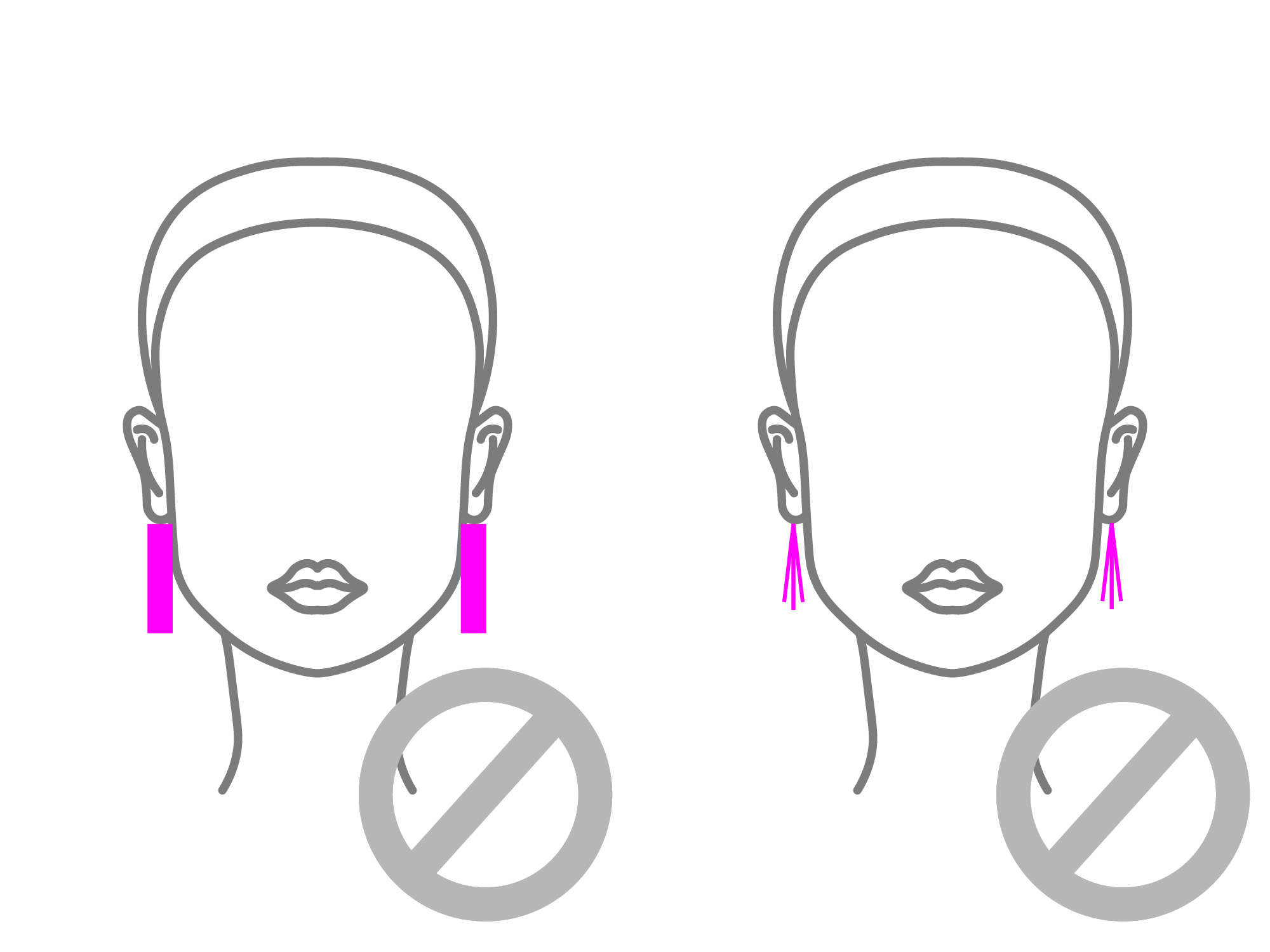 應避免選擇長條形、線條形耳環等拉長形的耳環;如果選擇有吊墜的耳環,耳環的長度不要超過下巴,否則強化了臉的長度;建議可以挑選圓形、扇形或圓環耳環來修飾臉型。要挑選視覺上能增加臉寬度的耳環,加強臉部的圓潤感。